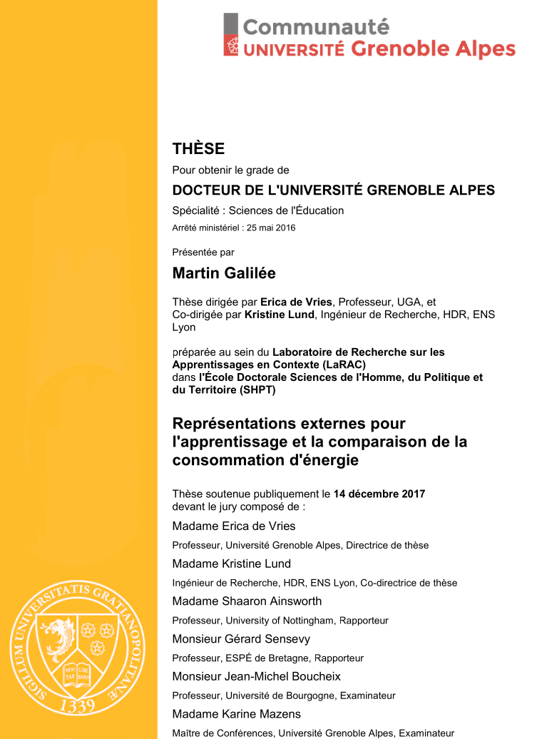 Thèse de sciences de l'éducation orientée sciences cognitives appliquées à la soutenabilité, sur le sujet des représentations visuelles et de la maîtrise de la consommation d'énergie, 2017